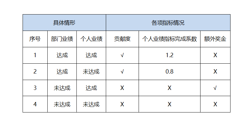 部门员工绩效=部门绩效奖金*员工贡献度*个人业绩指标完成系数+额外奖励