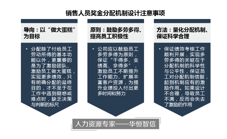 根据对多家企业的管理咨询经验和团队多年在绩效考核上的研究与实践经验,华恒智信认为在设计奖金分配机制时,应牢牢把握住以下三点: