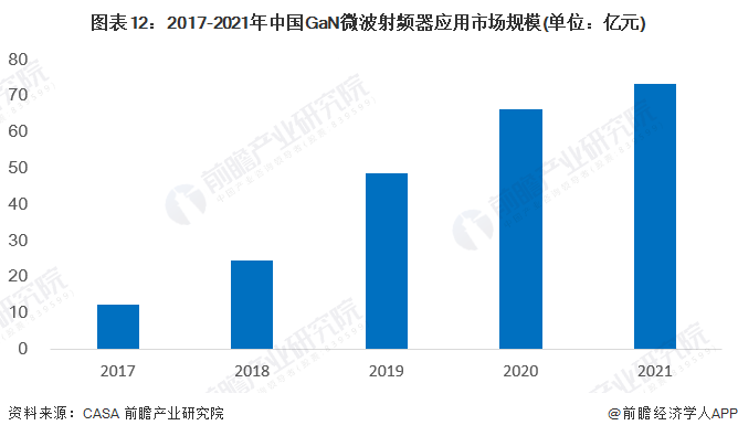 2021年,我国GaN微波射频器件市场规模约为73.3亿元,同比增长11%。其中国防军事与航天应用规模34.8亿元,成为GaN射频主要拉动因素。