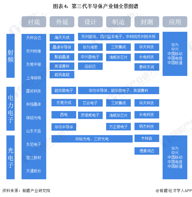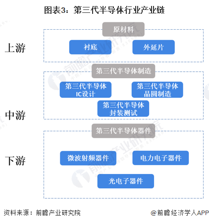 第三代半导体产业链分为上游原材料供应,中游第三代半导体制造和下游第三代半导体器件环节。上游原材料包括衬底和外延片;中游包括第三代半导体设计、晶圆制造和封装测试;下游为第三代半导体器件应用,包括微波射频器件、电力电子器件和光电子器件等。中国第三代半导体行业产业链如下: