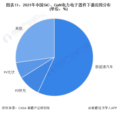 目前,GaN电力电子器件主要应用在快充领域。SiC电力电子器件重点应用于新能源汽车和充电桩领域。我国作为全球最大的新能源汽车市场,第三代半导体器件在新能源汽车领域的渗透快于整车市场,占比达57%;PD快充占9%;PV光伏占了7%。
