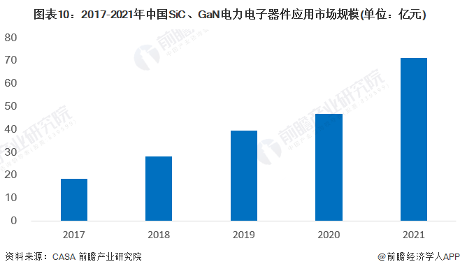 2017-2021年,中国SiC、GaN电力电子器件应用市场快速增长。2021年我国SiC、GaN电力电子器件应用市场规模达到71.1亿元,同比增长51.9%,第三代半导体在电力电子领域渗透率超过2.3%,较2020年提高了0.7个百分点。