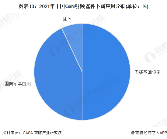 全国各地5G基站建设在近几年达到高峰,2021年无线基础设施是我国GaN微波射频器件的主要应用领域,占比约50%,其次为国防军事应用,市场占比约为43%。