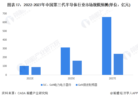 第三代半导体已经写入“十四五”规划。根据CASA的预测,在国家政策的支持和下游需求增长的背景下,预计未来五年,我国SiC、GaN电力电子器件应用市场将以45%的年复合增长率增长至2027年的超660亿元;GaN微波射频器件市场规模将以22%的年均复合增长率增长至2027年的超240亿元。2027年第三代半导体整体市场规模有望超过900亿元。
