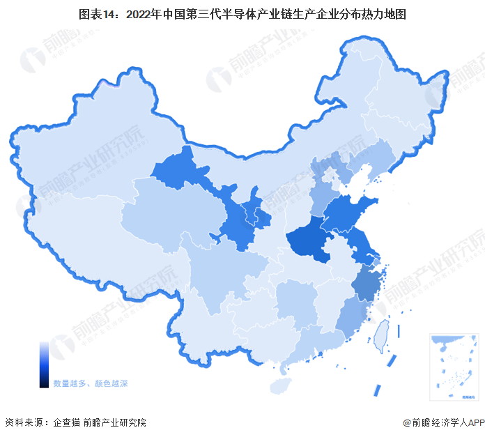 从代表性企业分布情况来看,江苏省第三代半导体代表性企业分布最多,如苏州纳维、晶湛半导体、英诺赛科等。同时广东、山东代表性企业也有较多代表性企业分布。