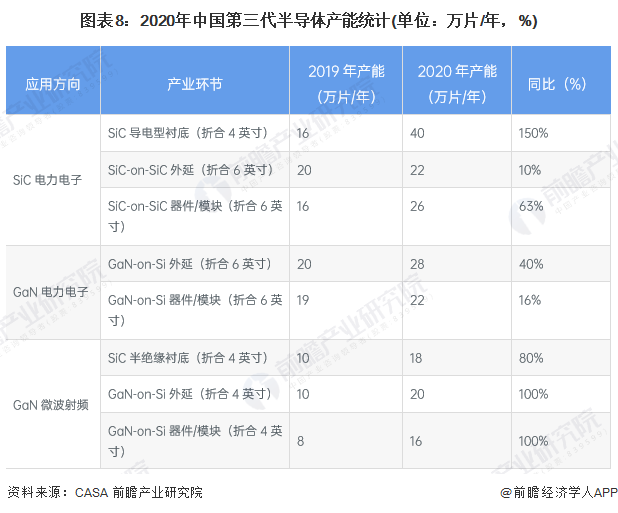 根据CASA数据显示截至2020年底,我国SiC导电型衬底折算4英寸产能约40万片/年,SiC-on-SiC外延片折算6英寸产能约为22万片/年,SiC-onSiC器件/模块(4/6英寸兼容)产能约26万片/年。