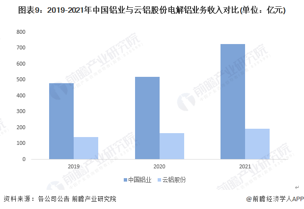 从电解铝业务的经营情况来看,2019-2021年,中国铝业的电解铝业务收入领先于云铝股份,2021年,中国铝业电解铝业务实现收入726.4亿元,云铝股份的电解铝业务实现收入191.3亿元。