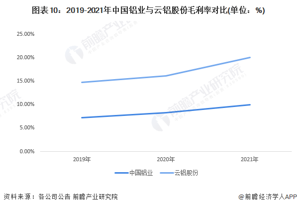 从电解铝业务的毛利率来看,2019-2021年,云铝股份的电解铝业务毛利率较高;从毛利率变化趋势来看,中国铝业与云铝股份的电解铝业务毛利率整体都呈现上升的趋势。2021年,中国铝业电解铝业务毛利率为10%,云铝股份电解铝毛利率为20%。