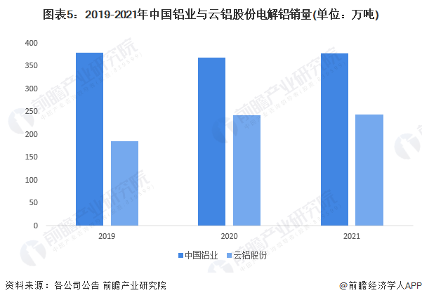 在电解铝产量和销量方面,2019-2021年,中国铝业产量与销量均最高,2021年产量为386万吨,销量为378万吨;云铝股份2021年电解铝产量为241.13万吨,销量为243.72万吨。
