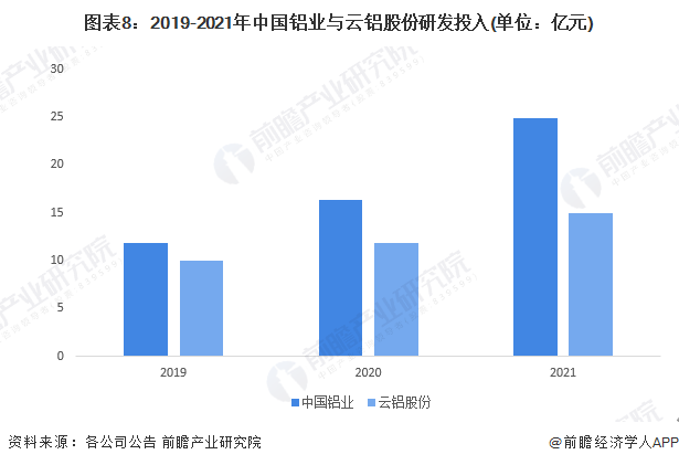 2019-2021年,中国铝业与云铝股份研发投入整体都呈现上升的趋势,2021年中国铝业研发投入为24.9亿元,云铝股份研发投入为15亿元。