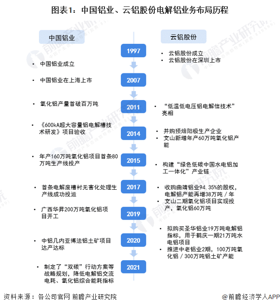 电解铝是一种应用广泛的基本金属,主要用于生产各种不同用途的铝加工材。铝材在生活中的应用广泛,包括轻工业、电器行业、机械制造、电子行业、交通运输、冶金以及房产建筑等行业。目前,中国电解铝行业的龙头企业为中国铝业与云铝股份,两家企业在电解铝业务上的布局历程如下: