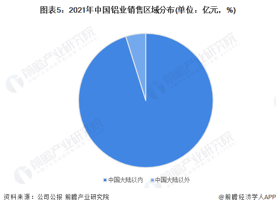 2021年,中国铝业中国大陆以内营业收入为2535.6亿元,占比95%,由此可知中国铝业销售区域主要分布在中国大陆以内。