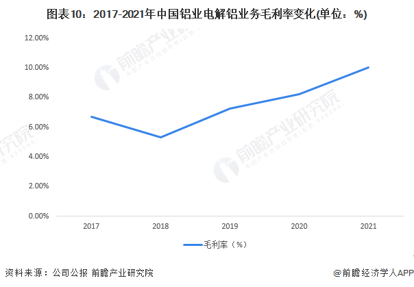 从电解铝业务收入角度分析,2017-2021年,中国铝业电解铝业务收入整体呈现增长的趋势,2021年中国铝业电解铝业务收入为726.4亿元。从电解铝业务毛利率分析,2017-2021年中国铝业电解铝业务毛利率整体呈现上升的趋势,2021年毛利率为10%。