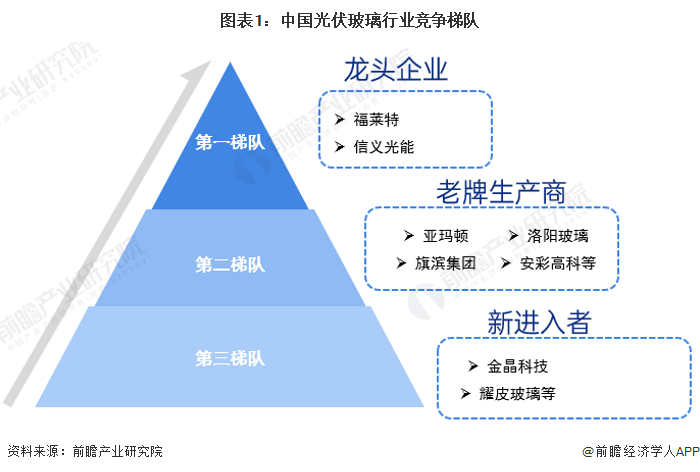光伏玻璃指应用在太阳能光伏组件上的玻璃,为光伏组件重要组成部分,具有保护电池片和透光的重要价值。目前我国光伏玻璃行业依据企业产能产量等数据,可以分为3个竞争梯队,其中第一梯队为行业内龙头企业福莱特和信义光能,产能在10000吨/天以上,优势较为明显;第二梯队为行业内的老牌生产商,虽然产能较小,但具有一定的资源和品牌优势;第三梯队为金晶科技和耀皮玻璃等新进入者。