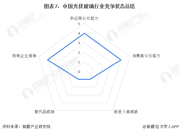 根据以上分析,对各方面的竞争情况进行量化,5代表最大,0代表最小,光伏玻璃行业的竞争情况如下图所示。