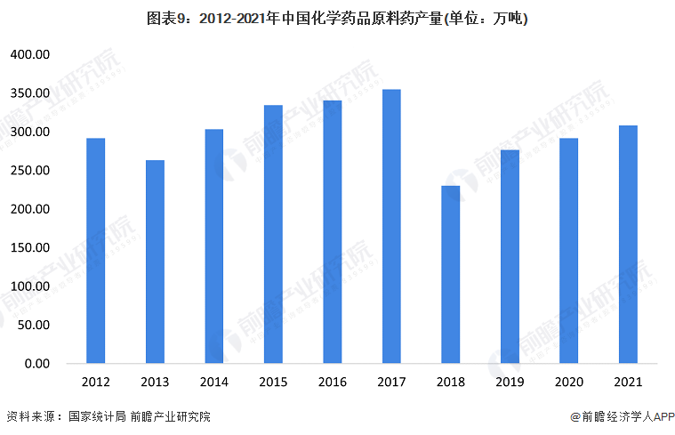 从化学药品原药产量来看,我国化学原料药产业曾经历了长期快速发展阶段,产量规模一度上升至超过350万吨,导致国内现阶段传统大宗原料药产能过剩,2018年开始,国内传统大宗原料药产量开始下降,2018年国内原料药总产量降至230.37万吨。2020年和2021年受疫情影响,国内原料药供给产量有所回升,2021产量再次突破300万吨,同比增长超过5%。