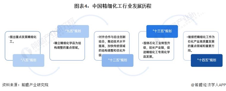到当前的“十四五”期间,根据中国石油和化学工业联合会副会长的发言,石化产业高质量发展、深化供给侧结构性改革,还应在产业结构和产品结构调整与优化上狠下功夫,还应在产品的高端化、差异化上狠下功夫,还应继续把精细化工作为石化产业高质量发展的重点领域和重要方向;而精细化工行业作为石化行业重要的细分领域,行业正处于由初、中级阶段向精细化工过渡时期,传统大宗通用级产品占比将逐渐下降,发展高技术高质量的产品是行业的重要发展方向。