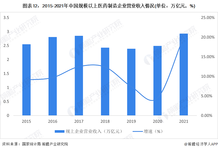 目前中国已成为全球化学原料药的生产和出口大国之一,还是全球最大的药物制剂生产国,同时,也成为世界疫苗产品的最大生产国,国产疫苗在满足国内居民防病、治病的同时,已开始向世界卫生组织提供疫苗产品,用于其他国家的疾病预防。2015-2020年我国规模以上医药制造业营业收入持续增加,2020年达到了2.49万亿元,同比上升4.5%。2021年,我国规模以上医药制造企业营业收入规模达到2.93万亿元,同比增长20.1%。整体来看,医药行业需求市场上升,未来发展潜力较大。