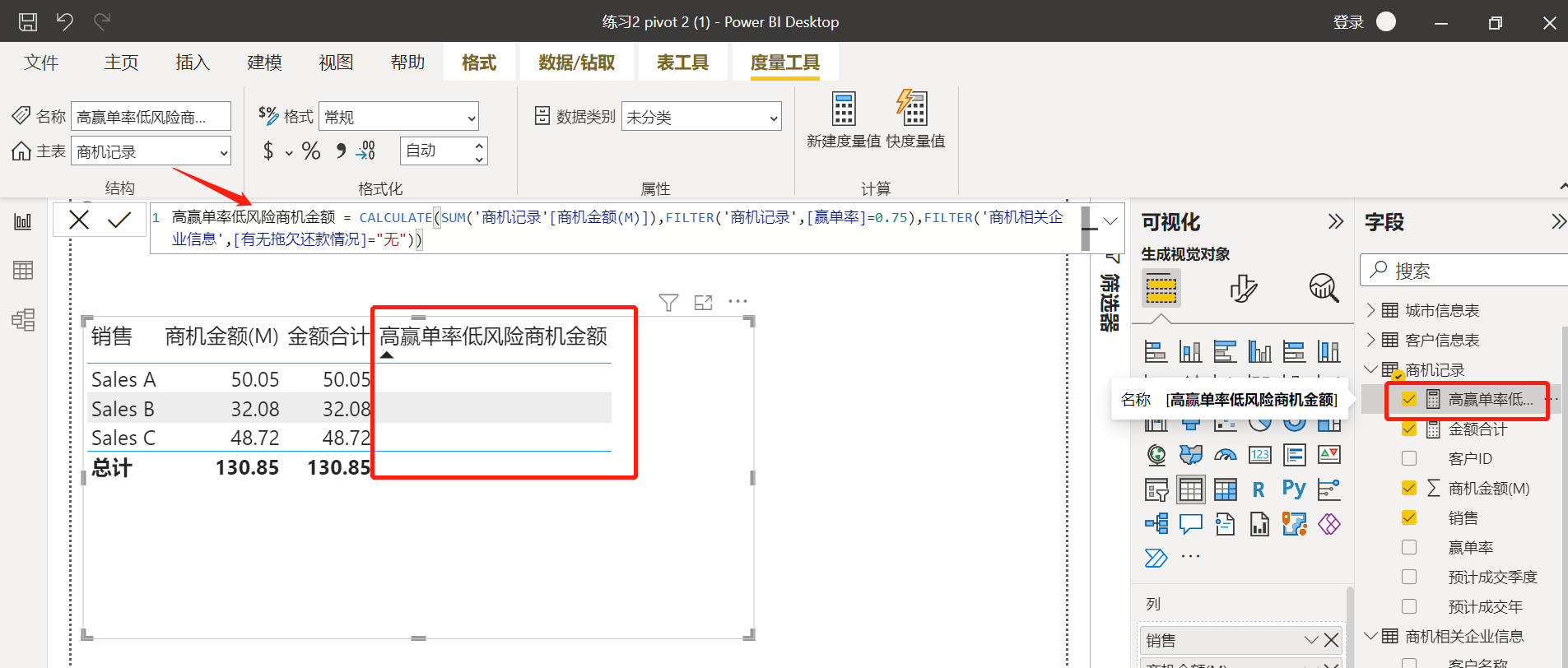 3.3 保存修改的表关系模型,然后去pivot可视化报表界面发现度量值结果就显示出来了