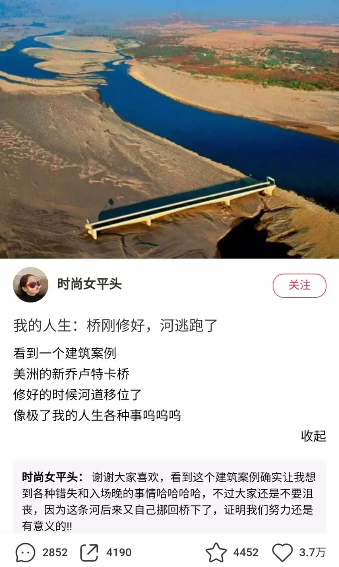 但很快,一条回复打破了这种自我调侃:你的人生不如那座桥,因为后面河道又移回去了。