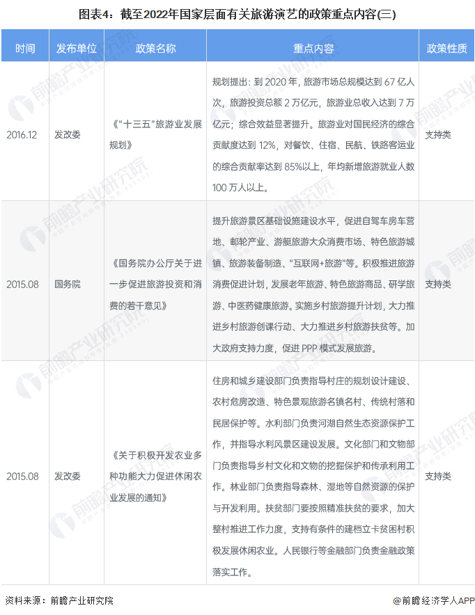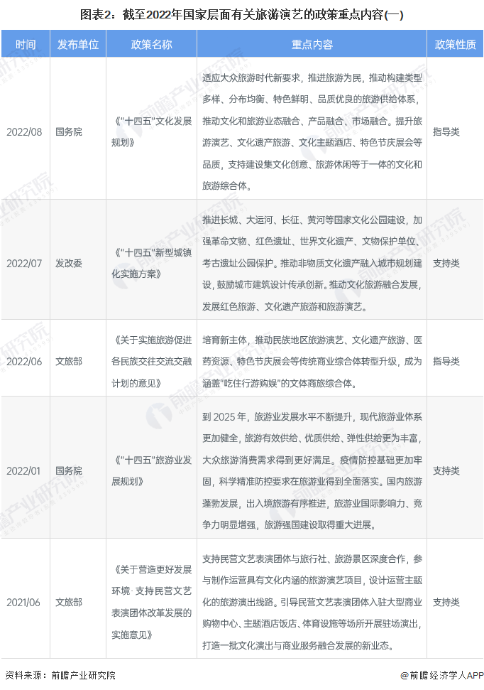 旅游演艺政策在十四五之前并未有相关政策重点提及。“十二五”期间旅游业方式发展粗放、旅游产品供给不足、产业结构失调、管理体制不顺而备受诟病,但此时现代旅游体系出现雏形。“十三五”期间有了明显的改善,“互联网+旅游”盛行,主要方向是提供包括演艺在内的更多精细化、差异化旅游产品。“十四五”期间政策上大力支持旅游演艺产品、业务、服务、市场参与者的发展,《“十四五”文化发展规划》中提及推动文化和旅游业态融合、产品融合、市场融合,提升旅游演艺品质。至此,旅游演艺在政策上得到国家层面的鼓励。