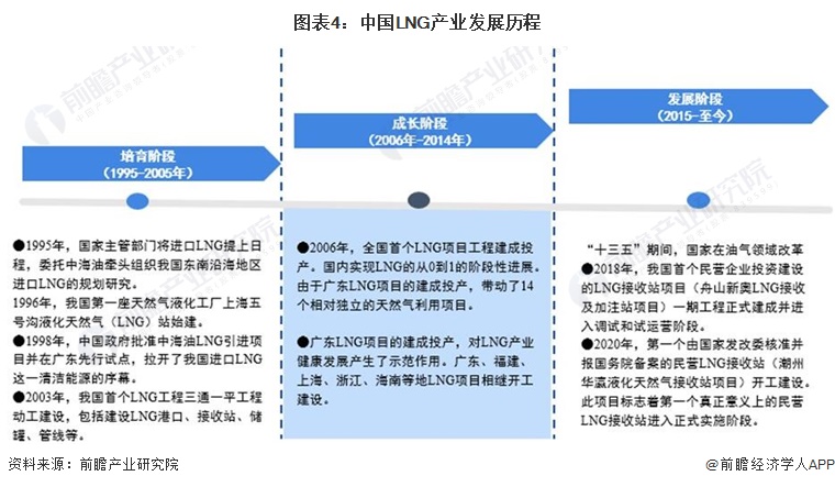 我国LNG行业开始于上世纪九十年代,1996年,隶属于上海燃气(申能集团)的上海五号沟LNG站始建,是国内第一座天然气液化工厂,服务于上海天然气供应的应急和调峰,同时兼顾上海周边地区的燃气保供任务。2006年,广东大鹏LNG接收站正式投产运作,拉开了中国进口LNG的序幕。“十三五”以来,随着国家在油气领域改革民营企业也加快了在LNG行业中下游投资布局的步伐,行业进入快速发展阶段。
