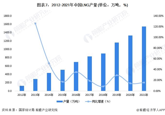 近年来,我国LNG产业发展迅速,国家统计局统计数据显示,2021年我国LNG产量1545.1万吨,同比增长15.92%,2012-2021年复合增长率高达31.92%。