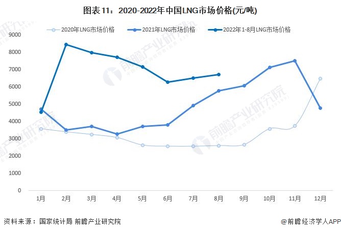 根据国家统计局数据显示, 2020年LNG市场价格平均值为3263.99元/吨,2021年LNG市场价格平均值为4970.05元/吨,2022年1-8月LNG市场价格平均值为6876.06元/吨。LNG价格同比去年大幅上涨的影响因素,除了此前2020年受到公共卫生事件影响整体价格偏低的基数因素外,主要的影响因素是进口价格、国产气源成本以及天气因素。
