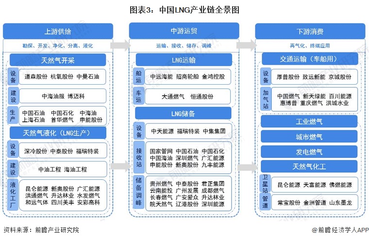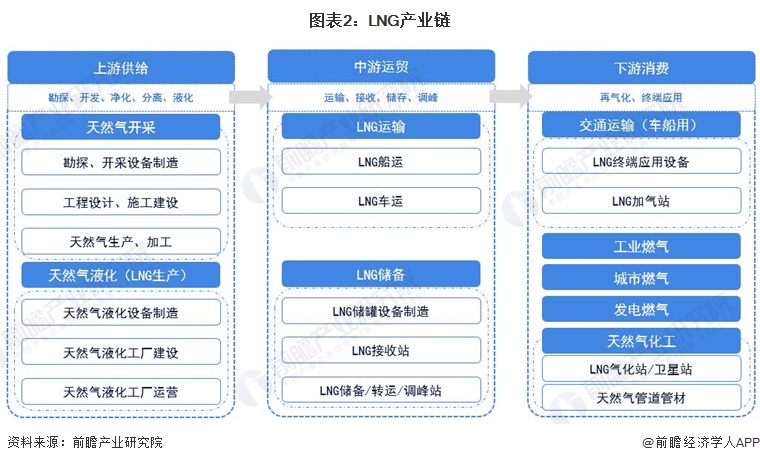 产业链上游:上游主要包括勘探、开发、净化、分离、液化等几个环节。产业链中游:中游主要包括LNG的储存和装载、运输,接收站(包括储罐和再气化设施)。产业链下游:下游环节即最终市场用户,包括联合循环电站,城市燃气公司,工业炉用户,工业园区和建筑物冷热电多联供的分布式能源站,天然气作为汽车燃料的加气站用户,以及作为化工原料的用户等,以及进一步向下延伸的LNG卫星站、加气站、LNG加注站及冷能利用等与LNG相关的所有产业。