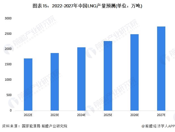 相对于其它能源,LNG具有清洁节能等诸多优势,国家对LNG产业的发展给予了高度的重视,广东、福建、上海、江苏等地纷纷投资兴建LNG项目,这为LNG产业发展创造了良好环境。随着国家对能源需求的不断升温,LNG行业的发展将对优化我国能源结构,有效解决能源供应安全、生态环境保护的双重问题。未来一段时期内,LNG将成为我国天然气市场的主力军。前瞻结合我国宏观经济发展趋势、国家产业支持政策、当前投产LNG项目产能状况,以及下游领域对LNG的需求拉动,预计到2027年我国LNG产量有望超过2700万吨。