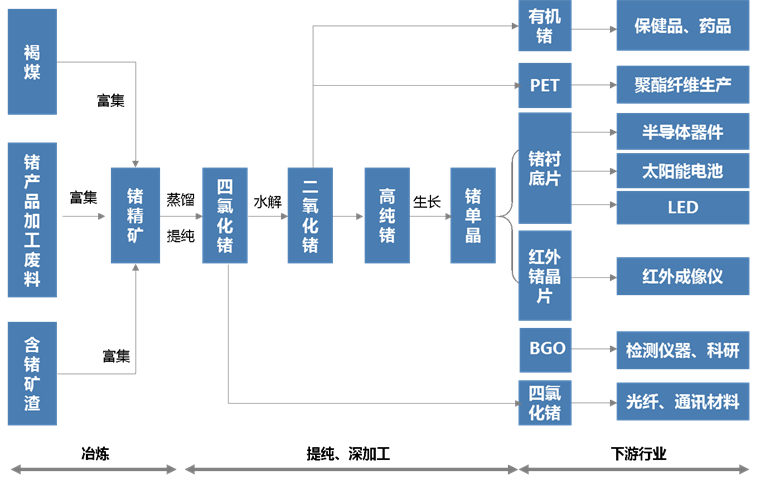 锗材料产业链包括从上游采矿、冶炼、中游提纯、深加工以及下游应用领域,主要涉及的应用行业有医药保健、半导体产业、太空光伏、LED显示、红外、安防、光纤、电子通信等产业。