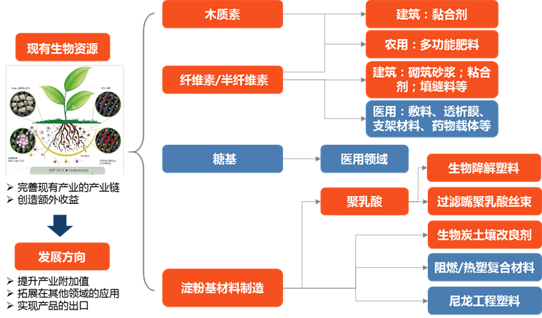 生物基材料可分为木质素、纤维素、糖基、淀粉基等类别。其中,木质素主要应用于建筑和农业领域;纤维素主要应用于建筑、医疗领域;糖基主要应用于医疗领域;淀粉基应用范围较广,在日用品、农业、建筑、生物医药、3D打印等领域均有应用。