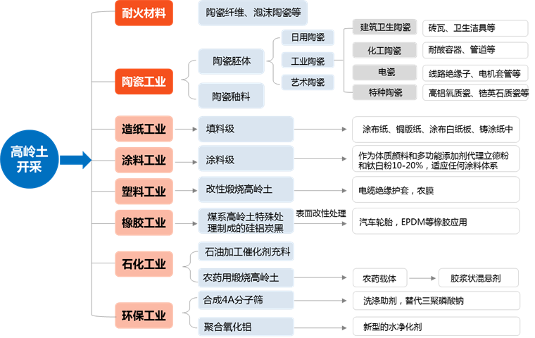 高岭土材料产业链下游应用领域包括耐火材料、陶瓷工业、造纸、涂料、塑料、橡胶、石化、环保等领域。