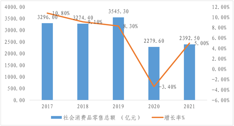 图3 2017-2021年石家庄市社会消费品零售总额及趋势
