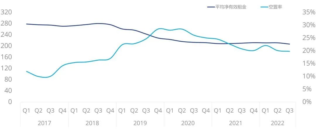 深圳甲级办公楼租金和空置率,2017Q1– 2022Q3
