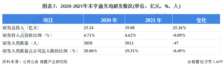 2021年公司研发投入达到19.08亿元,较2020年增长25.16%,研发投入占营收比例为4.62%,同比下降0.09%;研发人员数量达到3011人,较2020年减少47人,2021年研发人员占总员工的比例为19.51%。