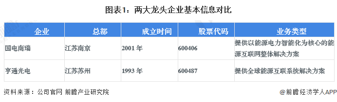 国电南瑞和亨通光电是中国能源物联网领域的两大龙头企业,两家企业均位于江苏,亨通光电成立时间早于国电南瑞。目前,两家龙头公司均在上海证券交易所上市。两家企业主要信息如下: