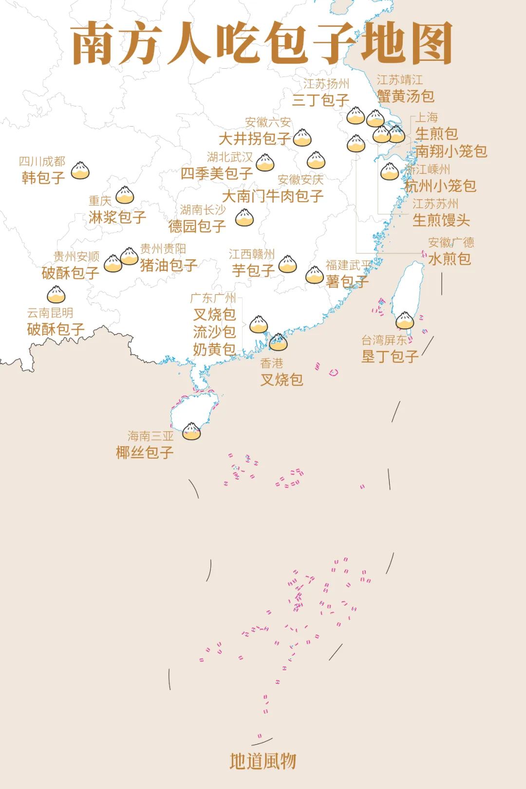 “包邮区”把包子称为“馒头”,有生煎和小笼灌汤包;赣闽客家地区用芋头和面,炸成薯包子或芋包子;云贵地区的包子皮像酥饼,称为破酥包;粤港澳大湾区除了叉烧包,还融合舶来甜品,创造出奶黄包和流沙包;而更远的海南和台湾,竟然还有椰丝包、芝士包……