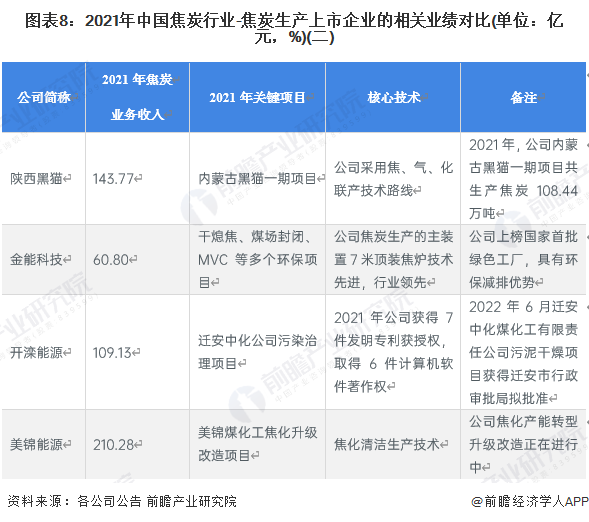 从八家焦炭生产企业业绩情况来看,陕西黑猫、开滦能源与美锦能源为我国焦炭龙头,2021年其业务收入均达到百亿级别。