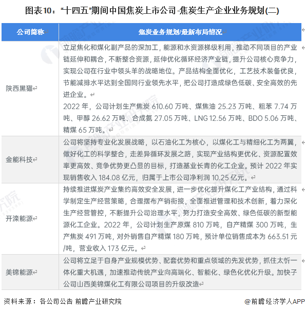 “十四五”期间,八家焦炭生产企业均有在年报中披露焦炭产量计划、投资项目规划等,其具体业务规划如下: