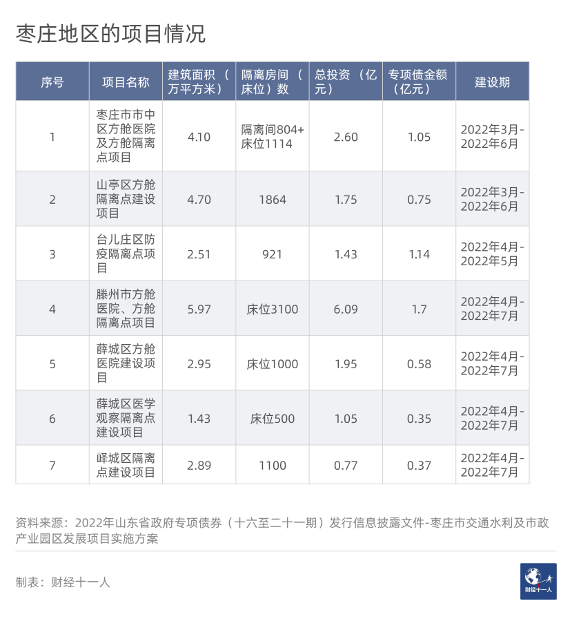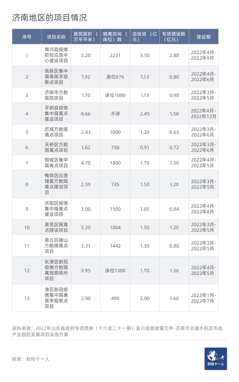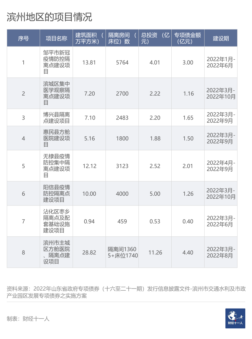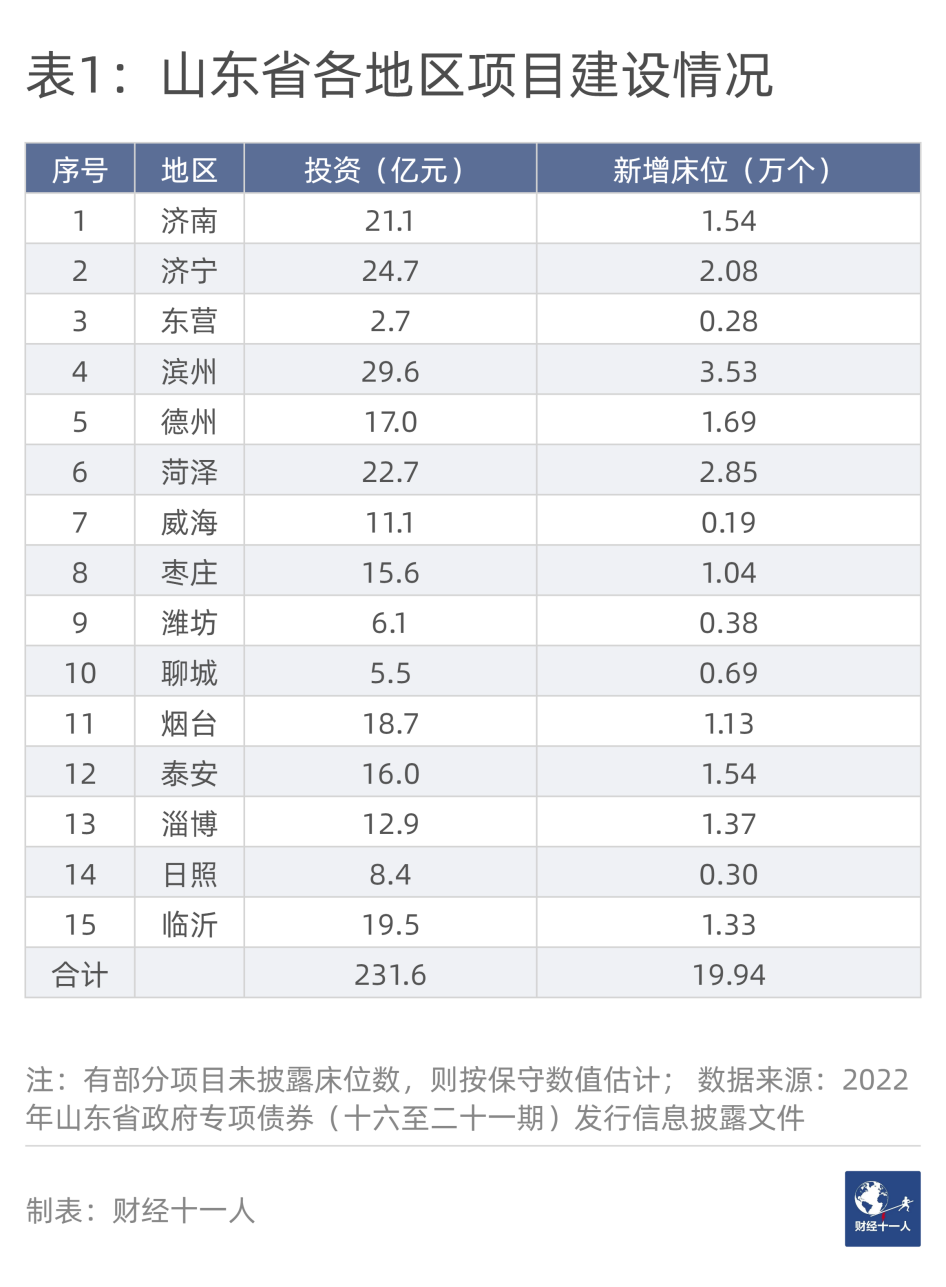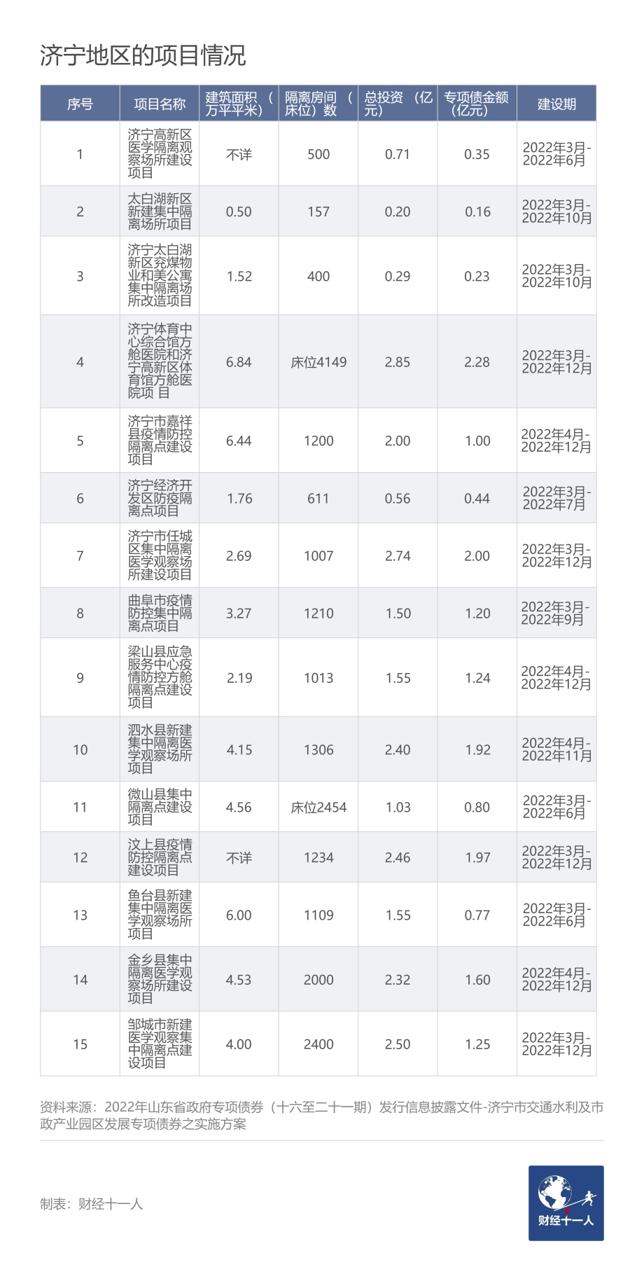 在2022年第16至21期的山东省政府专项债券报告中,我们找到了119份与方舱医院、隔离点相关的专项债券实施方案。这119份方案是除青岛市之外的山东省辖15个地级市的119个方舱医院、隔离点项目的具体实施方案。十五个地级市为济南市、淄博市、枣庄市、东营市、烟台市、潍坊市、济宁市、泰安市、威海市、日照市、滨州市、德州市、聊城市、临沂市、菏泽市。统计数据显示,这十五个地级市以及下辖地区共投资超过230亿元,建设119个方舱医院、隔离点,新增床位超过20万个(虽然表1中数据为19.94,但是此数据比较保守。很多项目只公布了隔离间数量,我们是按照一个隔离间一个床位计数,实际上有一个隔离间两个床位的情况)。具体项目、投资、新增隔离房间等数据见表2-表16。表1是这十五个地级市及下辖地区的投资与新增床位情况。滨州地区、菏泽地区、济宁地区新增床位数量最多,分别为3.53万个,2.85万个,2.08万个。(有些项目只公布了隔离房间数,这些项目按照每个隔离间一张床位的保守方式估计。)