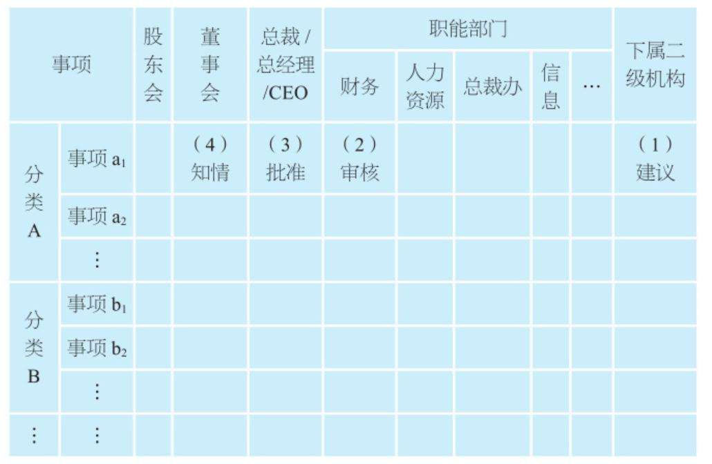 表2中的“(1)建议”“(2)审核”“(3)批准”“(4)知情”只是示例。(1)(2)(3)(4)代表权限行使和流转的顺序。如果企业是设有事业部的双层经营组织,表中的下属二级机构可以置换为事业部(事业部内部也有分权手册)。如果企业是未设事业部的单层经营组织,下属二级机构通常指具有清晰责任边界、有一定自主权限的生产板块(分厂、车间)、销售板块(销售部/销售公司/营销中心等)和研发板块(研发部/研发中心等)。如果下属二级机构内部也有多个管理层级,那么其内部亦需有分权规定。
