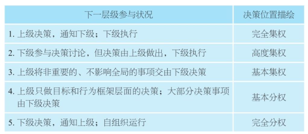 决策位置如何衡量呢?我们借鉴杰克·D·奥斯本(Jack D.Orsburn)和琳达·默兰(Linda Moran)的员工参与模型,从下一层级参与决策的程度角度,划分决策位置高低的几个档次(见表1)。