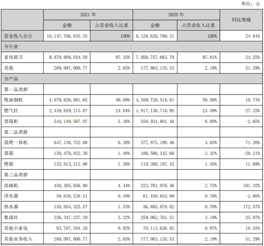 2019年起,老板电器重新将公司产品划分为三大品类,并制定了扩大第一品类优势、领先第二品类、稳步推进第三品类的战略。其中,“烟灶消”传统强势产品为第一品类,蒸箱、烤箱及一体机产品为第二品类,洗碗机、净水器、热水机、集成灶产品为第三品类。