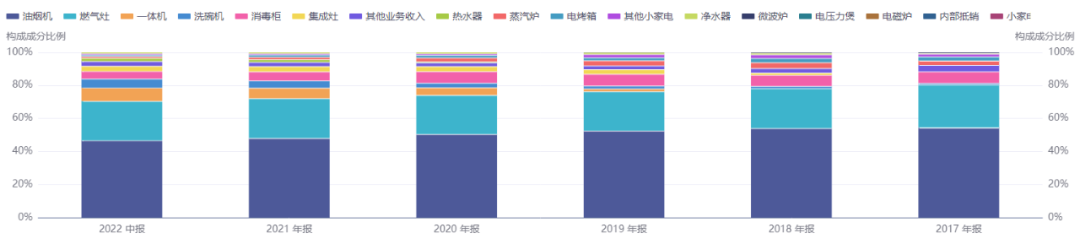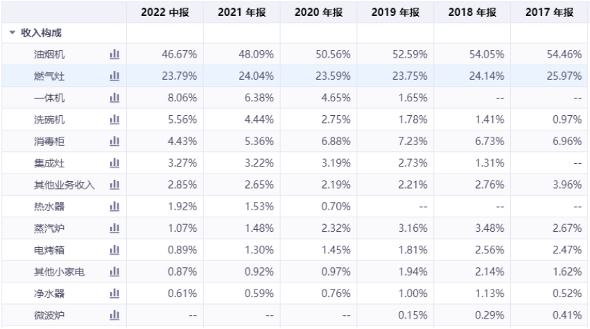 从营收构成上看,厨电三大件(吸油烟机、燃气灶及消毒柜)一直是老板电器的核心业务。2018年以前,三者营收合计占比超过85%。近年来,为了摆脱对厨电三大件的依赖,老板电器不断拓展蒸箱、烤箱等新品类业务的发展,并成立独立的蒸箱事业部作为公司第二大战略发展品类。