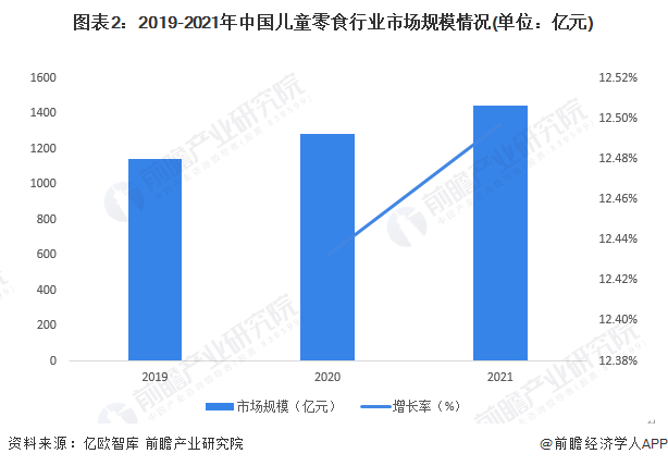 2019-2021年,中国儿童零食行业市场规模逐年增长,2021年达到了1445.7亿元,增长率为12.5%。