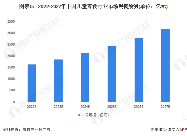 未来随着中国三胎政策及其配套措施的落地,市场对于儿童零食的重视度会越来越高,预测2022-2027年中国儿童零食行业市场规模年均增长率将达到14%,到2027年市场规模有望达到3172亿元。