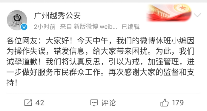 12月2日晚,“广州越秀公安”账号针对此事发布回应:“各位网友:大家好!今天中午,我们的微博休班小编因为操作失误,错发信息,给大家带来困扰。为此,我们诚挚道歉!我们将认真反思,引以为戒,加强管理,进一步做好服务市民群众工作。再次感谢大家的监督和支持!”