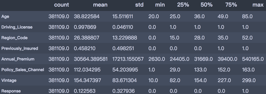 - desc_table = train.drop(['id', 'Vehicle_Age'], axis=1).describe().T