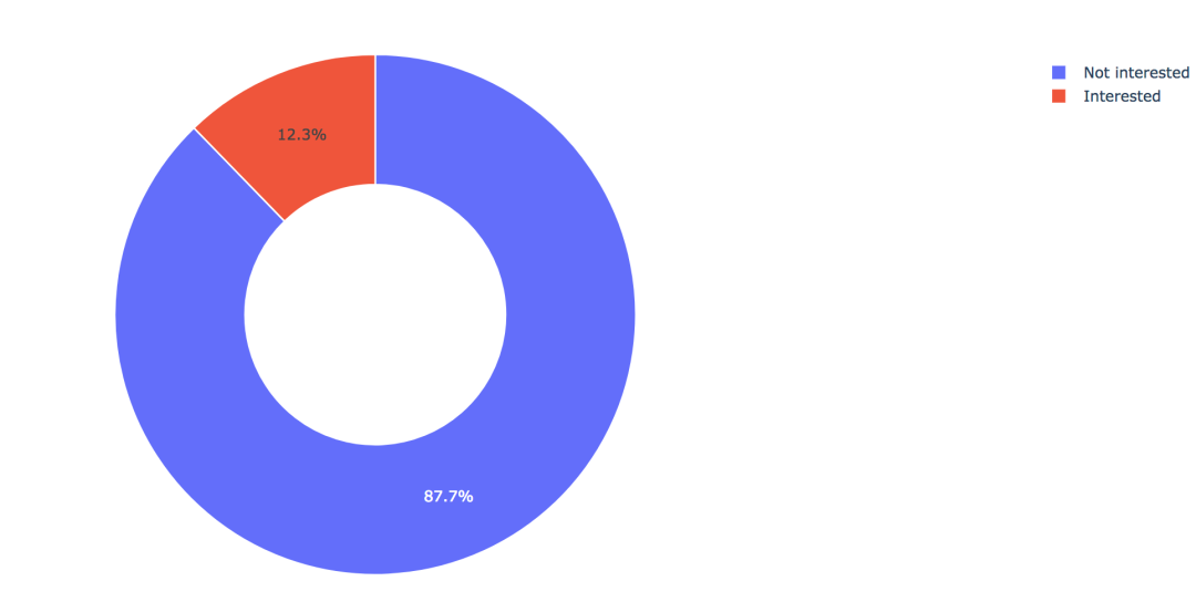 - trace1 = go.Pie(labels=['Not interested', 'Interested'],